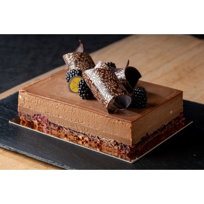 Sur une base fondante de biscuit brownie se dépose un coulis de mûres sauvages, délicatement acidulé, associé à un crémeux noisette onctueux.